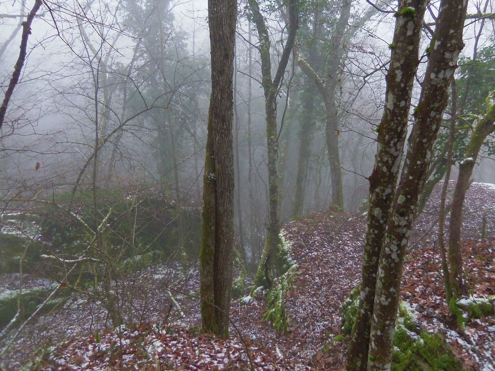 Le léger brouillard qui nous accompagne s'est épaissi, nous ne voyons même plus la ferme de la Rente Neuve à proximité de laquelle notre chemin débouche.